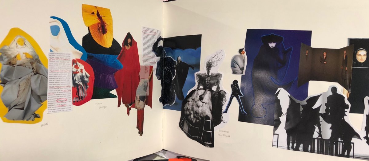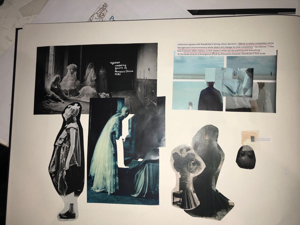 I did many sketches that were directly inspired from the outcomes on the 24 hours project, such as expanding the plastic bag concept but creating it around the head, or using chicken with and wood to create a similar silhouette to the lampshade one. I also used tape to create my illustrations, but my ideas started to become stuck as i realised i had an ongoing theme of just creating bulky body shapes. I thought about why our bodies start to change, and I remember a quote from Rei Kawakubo that said 'Fashion is something you attach to yourself, put on, and through that interaction the meaning of it is born. Without the wearing of it, it has no meaning, unlike a piece of art.' This made me think about changing the position of clothing and how that can gradually change body shape, and I want to express this through a simple draping of a black organza or mesh sheet of a few rods attached to the body which will show the ongoing change of body shapes.