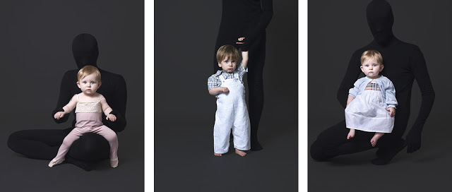 In the first part of Blommers and Schumm’s ‘Kidswear’ series, an anonymous figure clothed in a full black body suit holds the child against a dark backdrop. The children model clothing that is bright and spunky, at odds with the shadowy figure in the background. The dark figures are not themselves ominous: in fact, they usually seem to tenderly embrace the child as a mother would. But there is something undeniably unsettling about this act of hiding in plain sight, a feeling which also permeates the Victorian hidden mother photographs.